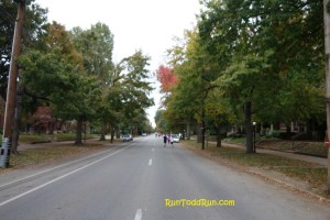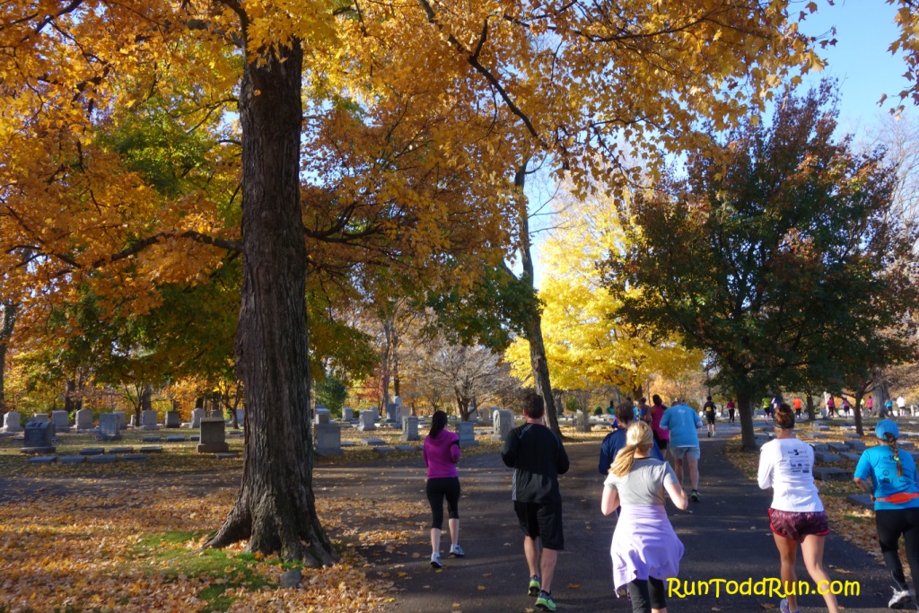 The views in the park were gorgeous with the fall colors and vistas at the top of the hills.  The best part about the hilly park portion is that there is a nice long downhill section coming out of the park.  A highlight of the course was a new section that was added this year that took the runners through Cave Hill Cemetery just past the halfway point.  This part of the course was definitely a great addition, and added to the beauty of the run.