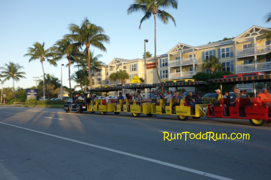 They had a conch train of cheering fans and cowbells that made a couple of appearances.  This was a cool idea, since there was not much of a crowd on the rest of the course.   There were a couple of pockets of ardent supporters though.  One group at the beach was still there, misting hose in hand, cheering on the remaining marathoners hours later when we were on our way out of Key West.