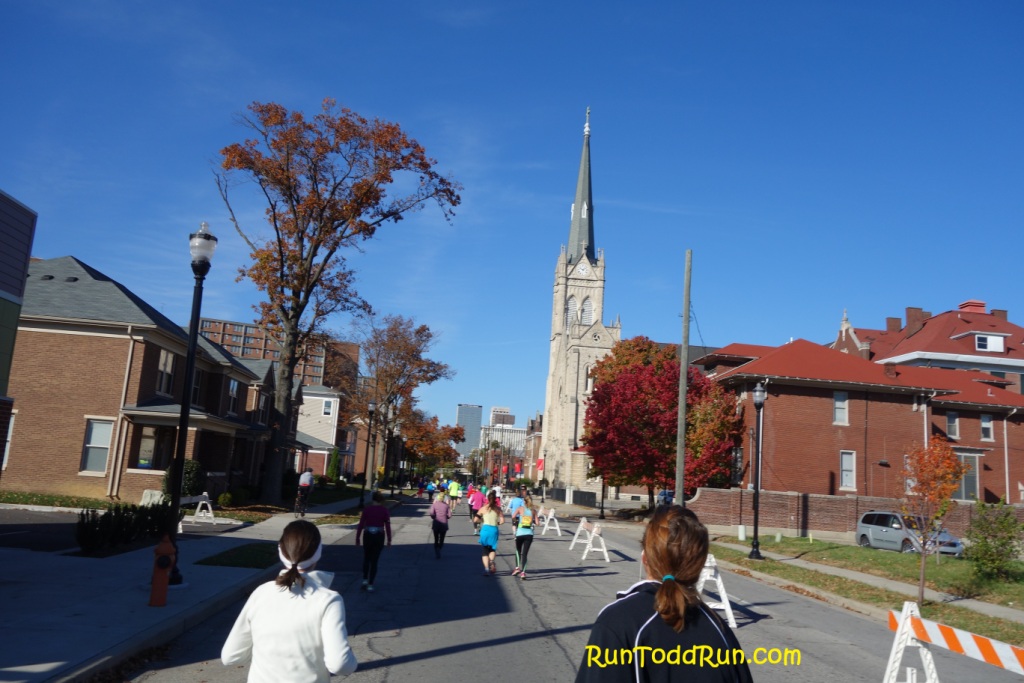 Before I knew it, we were off.  I settled into a comfortable pace, determined to keep it consistent.  The course heads out of downtown Louisville toward Cherokee Park.  The park portion of the course is gorgeous in the fall.  It is rather hilly, but is my favorite part of the course.  There was some pretty good crowd support and bands along the course as well.