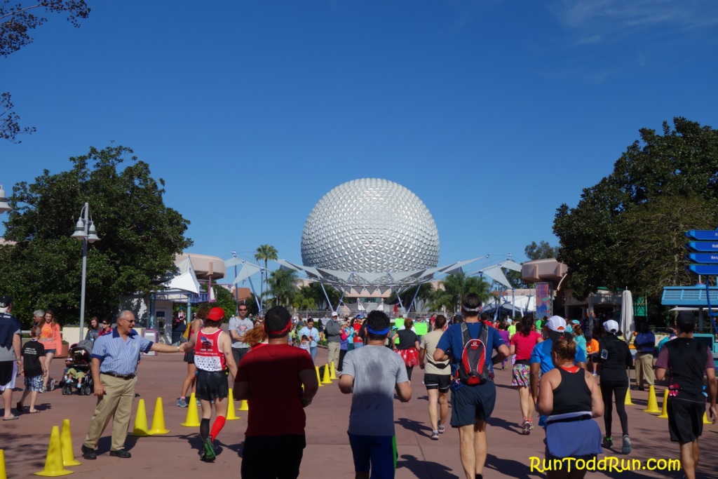 After rounding the Boardwalk, we re-entered Epcot at mile 5.5 near Journey Into Imagination and headed through Future World West to the finish, back in the Epcot parking lot near where we started.