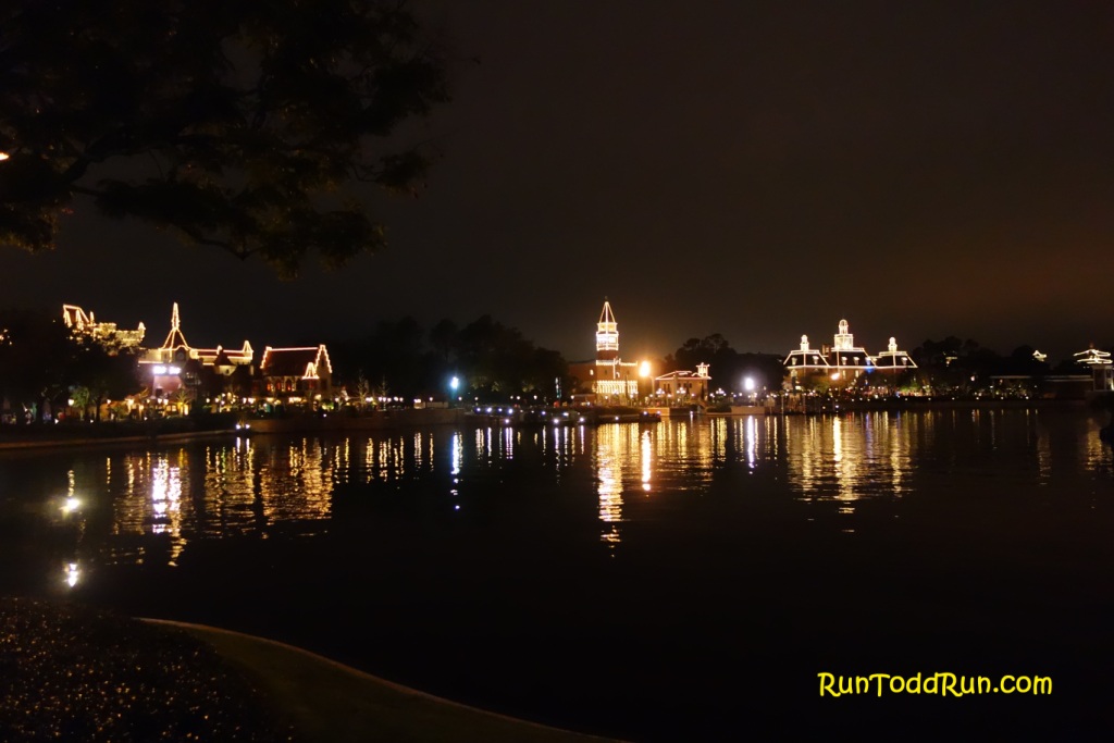 After passing under Test Track back stage, we entered Epcot in Norway at about mile 3.5.  It was really cool seeing Epcot lit up in the dark, and it made for a very pretty run, despite the humidity.  We rounded World Showcase and headed toward the boardwalk.  I could be heard several times saying, “I won’t be this happy next time I run here,” foretelling the upcoming Marathon.