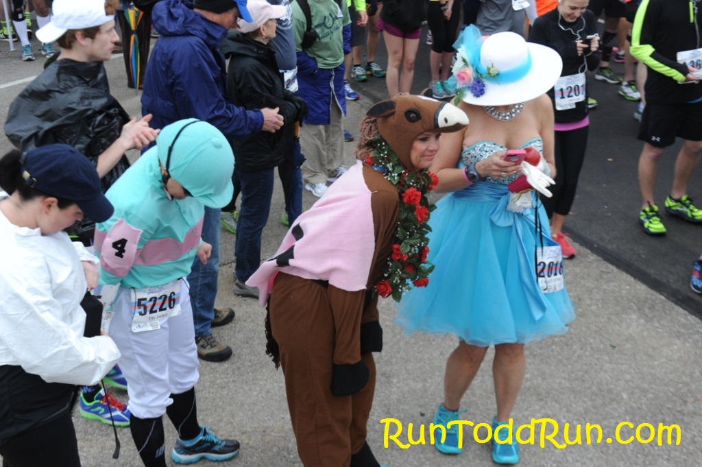 Last year, the key word was “hills.”  This year, it was “rain,” which will explain the lack of pictures.  There was a 100% chance of rain, and we knew it was coming all week.  As a result, I did not carry a camera.  Luckily the start was rain-free.  Parking was much better than last year due to a lack of construction, and we made it in plenty of time to get a pre-race bathroom break.