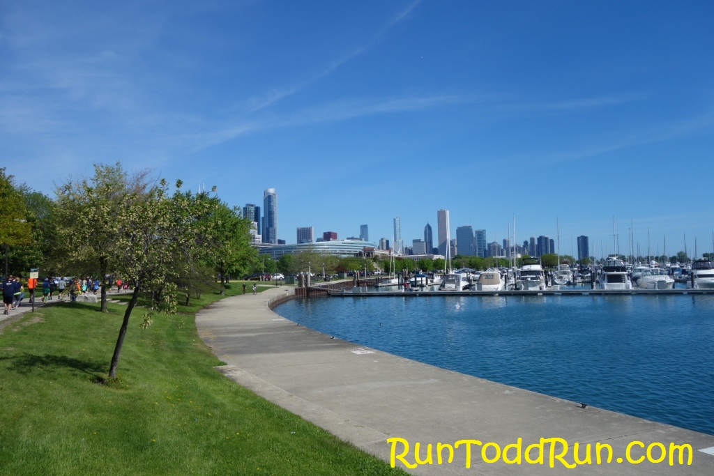 The course was an out and back along Lake Michigan and part of it utilized Lake Shore Drive until the turn-around point.  We turned around at about mile 5 and returned via a path along the Lake.   All along the way there were pockets of supporters and folks cheering, in addition to a couple of bands which livened things up a bit.