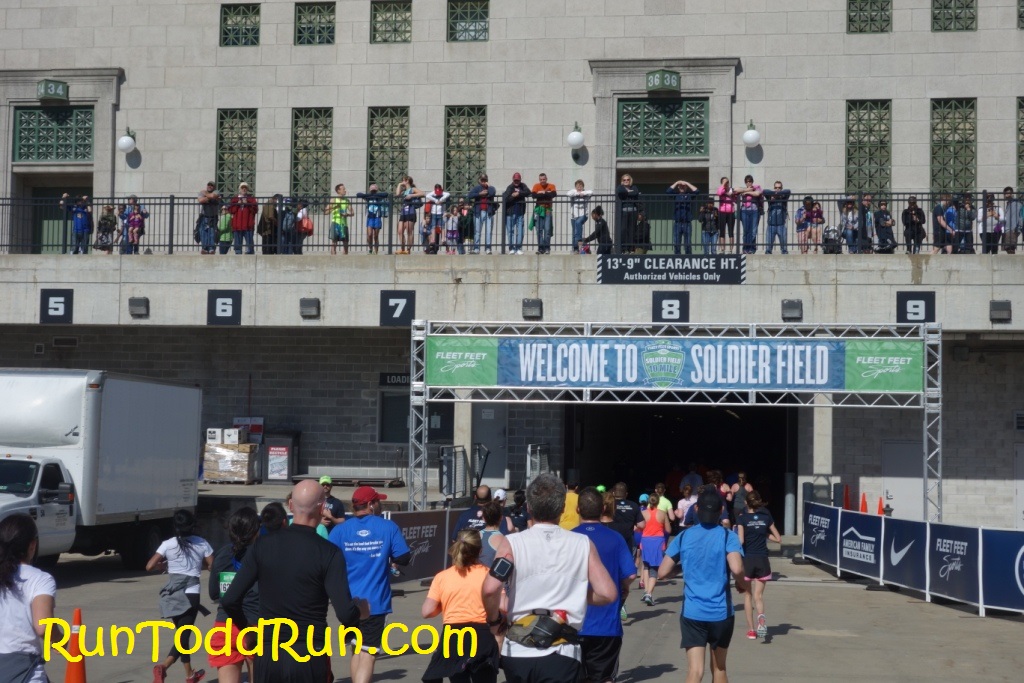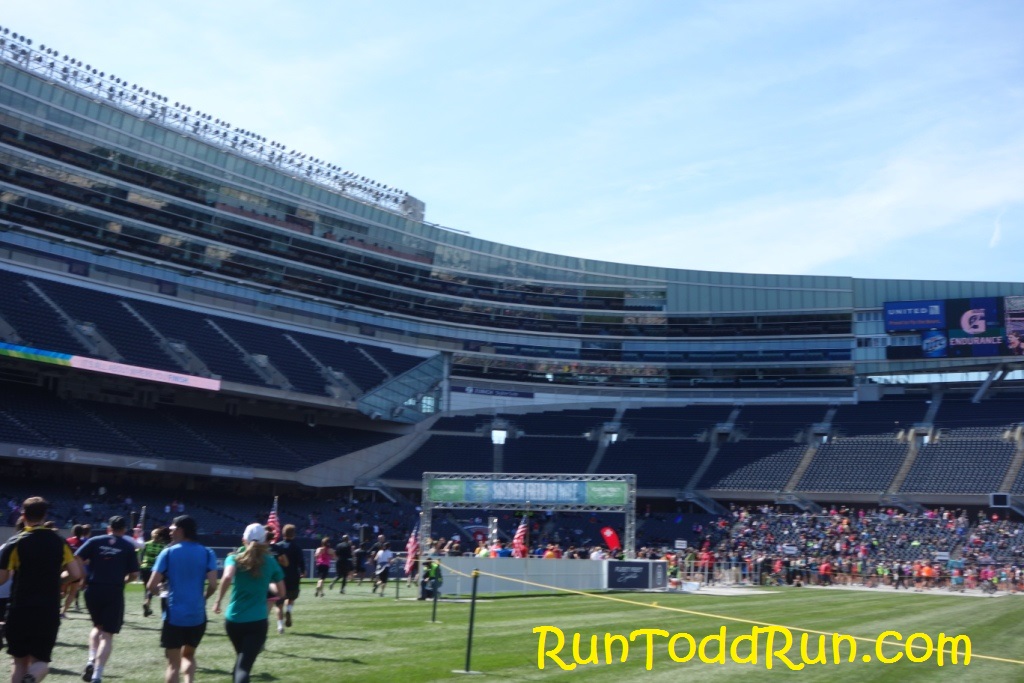 One of the main selling points of the run is that you get to finish on the 50 yard line of Soldier Field (“It’s All About Where You Finish”).  The route to get to the 50 took us past the field and through a service entrance.  After a quick jaunt through the bowels of Soldier Field (which my Garmin did not like), we entered through a tunnel onto the field.  It was a really great way to finish the run.